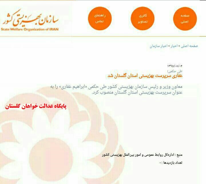 به گزارش پایگاه عدالت خواهان"ابراهیم غفاری بهعنوان مدیرکل جدید اداره کل بهزیستی استان گلستان معرفی شد.رقیه رحمانی مدیرکل سابق بهزیستی استان گلستان ظهر چهارشنبه تودیع و ابراهیم غفاری بهعنوان جانشین وی معرفی شد.