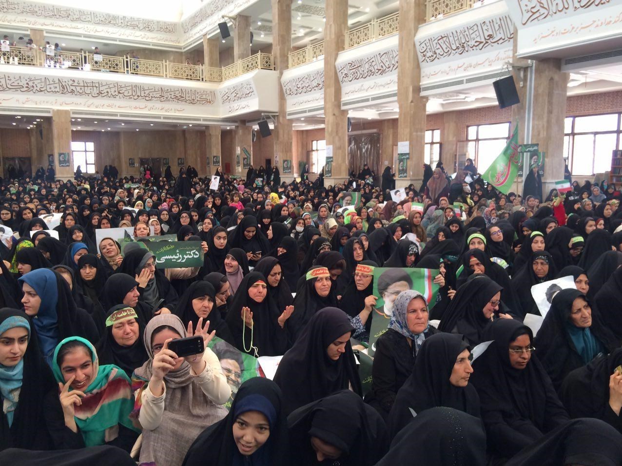 مردم حاضر در مصلی با شعارهای "ابراهیم بت‌شکن، بت فساد را بشکن"، "لطف امام هشتم، تغییر به نفع مردم"‌ و "سید مظلوم ما، رئیس‌جمهور ما" به استقبال حجت‌الاسلام رئیسی رفتند. /تسنیم