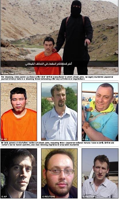 «هاونا یوکاوا» (Haruna Yukawa)، (عکس سمت راست)، تبعه ژاپنی، «دیوید هینز» (David Haines)، امدادگر انگلیسی (عکس وسط)، و «آلن هنینگ» (عکس چپ)، چند روز قبل از «کنجی گوتو»، با چاقویی که جیهادی جان بر گردن آنها کشید، سربریده شدند.