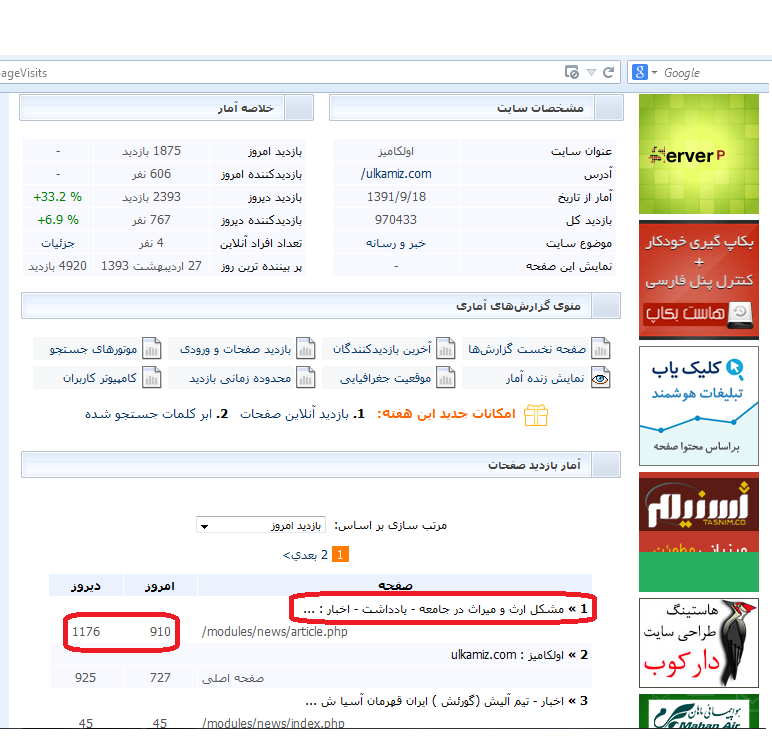در حال حاضر اگر به قسمت خلاصه آمار سایت برویم و وارد وبگذر شویم و با کلیک بر روی بازدید صفحات ورودی بالاترین تیتری که بیشترین بازدید را شده متعلق به یادداشتی است بنام "مشکل ارث و میراث در جامعه" که امروز حدود ساعت 9 شب عدد حدود 910 را نشان می دهد و بازدید دیروز حدود 1176 نفر است .