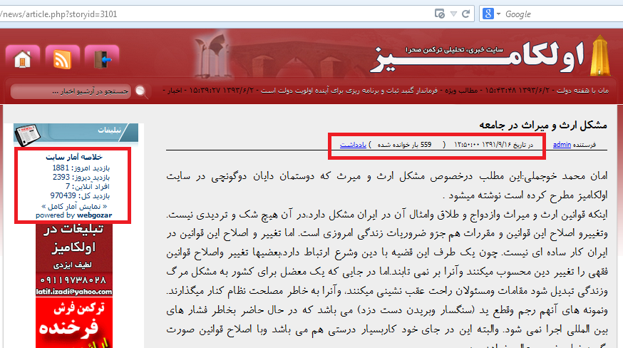 که اگر همین تیتر" مشكل ارث و میراث در جامعه" را در موتور جستجوگر گوگل سرچ کنیم متوجه می شویم که این یادداشت مربوط به 16 آذر سال 91 است و از زمان درج این یادداشت درسایت الکامیز از تاریخ 16 آذر 91 تا کنون فقط 558 بار بازدید شده و این یعنی دستکاری در آمار روزمره که  سایت در پیش گرفته است .