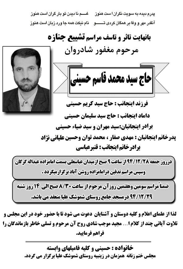سید قاسم حسینی متولد روستای شموشک علیا و جانباز دوران دفاع مقدس بود که مدتی هم در واحد جانبازان بنیاد شهید گلستان کار می کرد.