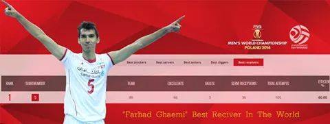 فرهاد قائمی نیز دیگر بازیکن ایران است که به عنوان بهترین دریافت کننده رقابتهای جهانی معرفی شده است. آمار تاثیرگذاری قائمی در دریافت 60/66 درصد اعلام شده است. موریلیو اندرس برزیلی که ارزشمندترین بازیکن دوره گذشته همین مسابقات قهرمانی جهان هم هست، پس از قائمی با 54 درصد تاثیرگذاری نفر دوم است.