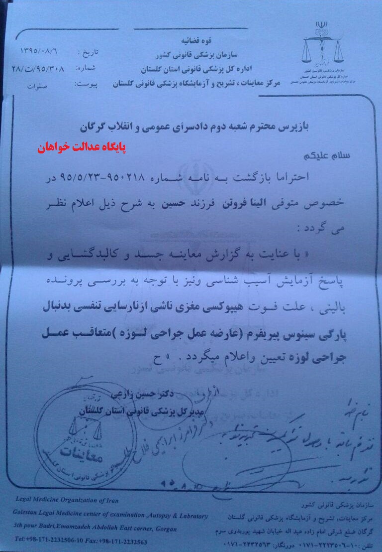 سنداعلام علت مرگ الیا فروتن کودک 6 ساله گلستانی توسط پزشکی قانونی استان گلستان
