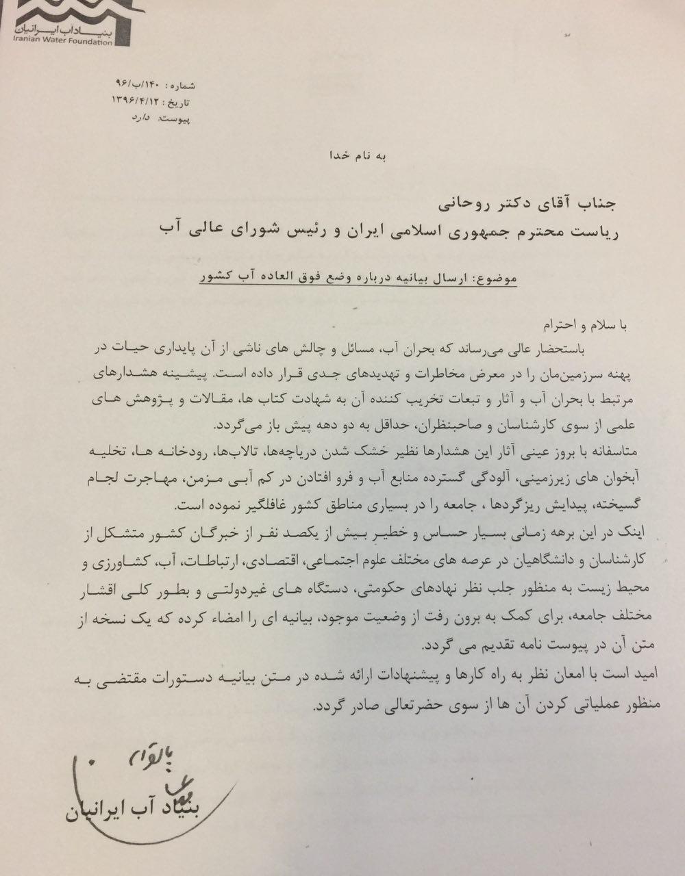 حالا بنياد آب ايرانيان درباره "وضع فوق العاده آب در کشور" نامه‌اي براي حسن روحاني فرستاده است، در بخشي اين نامه آمده است: