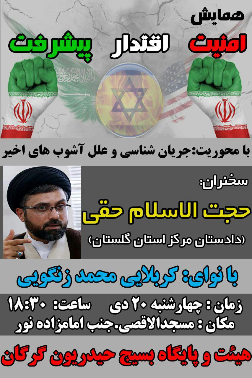 پوستر/همایش امنیت،اقتدار و پیشرفت با سخنرانی دادستان مرکز استان