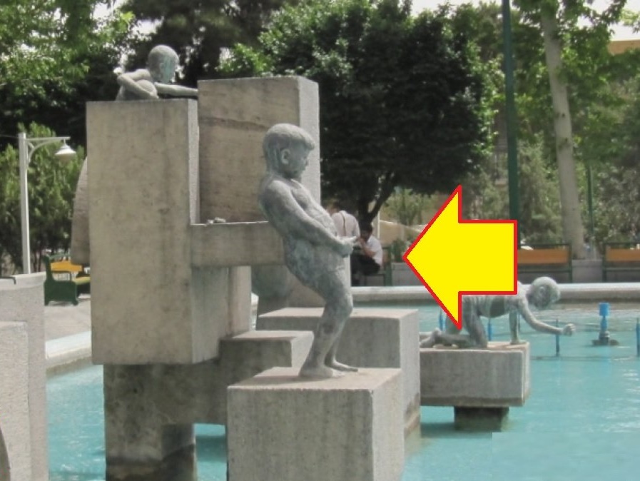 یکی از نکات جالبتوجه در این پارک، مجسمههای سنگی پارک است که یکی از آنها حسابی جلبتوجه میکند. مجسمه یکی از کودکان کاملاً مبتذل و غیراخلاقی است. کودکی در حال دست به آب است؛ آبی که از مجسمه خارج میشود بهنوعی ادرار کودک است.