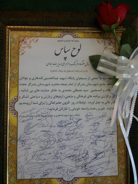 همچنین لوح سپس جوانان بندر گز از امام جمعه این شهرستان توسط منوچهر متکی به سید مصطفی محمدی داده شد .