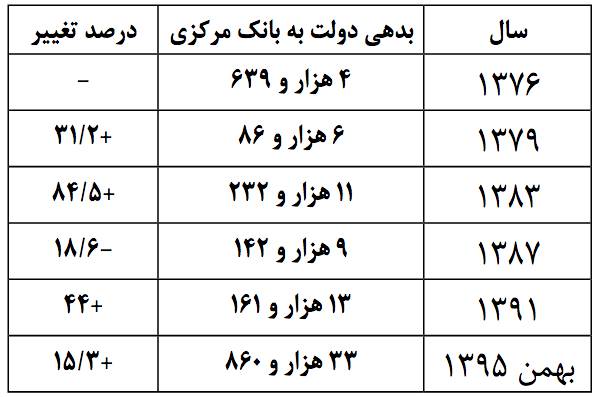 به گزارش فارس، همان‌طور که از ارقام جدول بالا کاملا مشخص است، بدهی به بانک مرکزی در دولت هفتم 31.2 درصد و در دولت هشتم 84.5 درصد افزایش یافته است. در مجموع بدهی دولت اصلاحات به بانک مرکزی 142 درصد افزایش داشته است.همچنین بدهی به بانک مرکزی در دولت نهم 18.4 درصد کاهش یافته و اما در دولت دهم با 44 درصد رشد مواجه شده است. مجموع رشد بدهی در دولت‌های نهم و دهم 17.2 درصد رشد کرده است.
