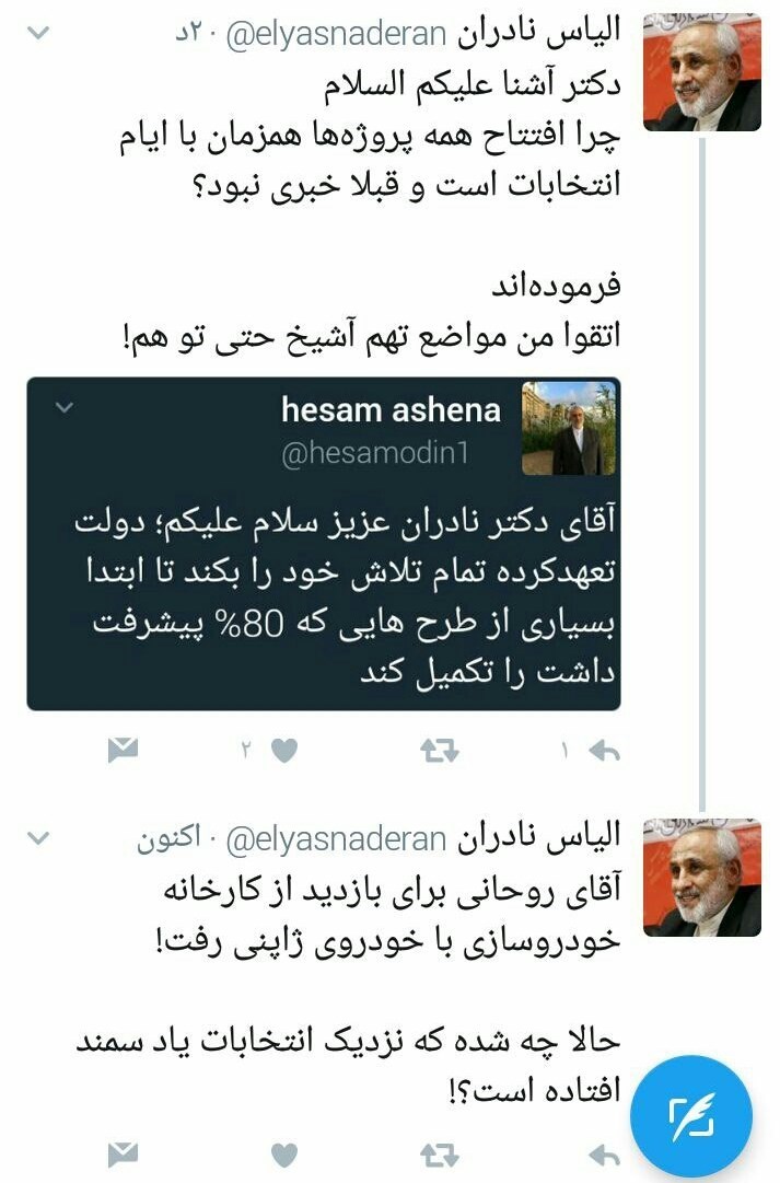به گزارش پایگاه عدالت خواهان"الیاس نادران در همین باره در حساب کاربری خود خطاب به حسام‌الدین آشنا که توئیت کرده بود:‌ آقای دکتر نادران عزیز سلام علیکم؛ دولت تعهد کرده تمام تلاش خود را بکند تا ابتدا بسیاری از طرح‌هایی که 80% پیشرف داشت را تکمیل کند، نوشته است: دکتر آشنا علیکم‌السلام چرا افتتاح همه پروژه‌ها همزمان با ایام انتخابات است و قبلا خبری نبود؟ فرموده‌اند "اتقو من مواضع تهم آشیخ حتی تو هم !"