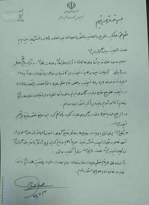 در رد برخی شایعات مبنی بر حمایت اینجانب از کاندیدای خاص در انتخابات سال آینده، و پیرو نامه مورخ ۹۵/۰۷/۰۶ اینجانب به حضور مقام معظم رهبری، متواضعانه به استحضار می رساند؛
