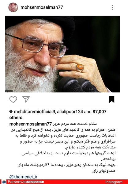 جهت لبیک به سخنان رهبر عزیز ، وعده ما ۲۹اردیبهشت ماه پای صندوقهای رای./فارس