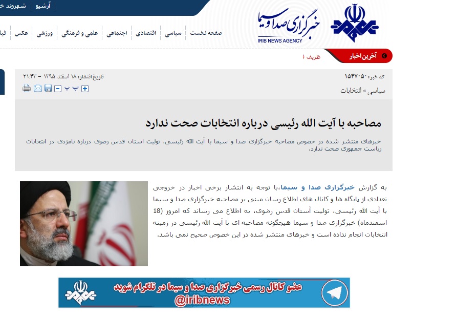 خبرگزاری صدا و سیما نوشت: با توجه به انتشار اخباری در خروجی برخی پایگاه ها و کانالهای اطلاع رسانی مبنی بر مصاحبه خبرگزاری صدا و سیما با آیت الله رئیسی تولیت آستان قدس رضوی به اطلاع میرساند امروز مورخ 18 اسفند ماه خبرگزاری صدا و سیما هیچگونه مصاحبه ای با آیت الله رئیسی در رابطه با انتخابات انجام نداده است و خبرهای منتشرشده در این خصوص صحیح نمی باشد.