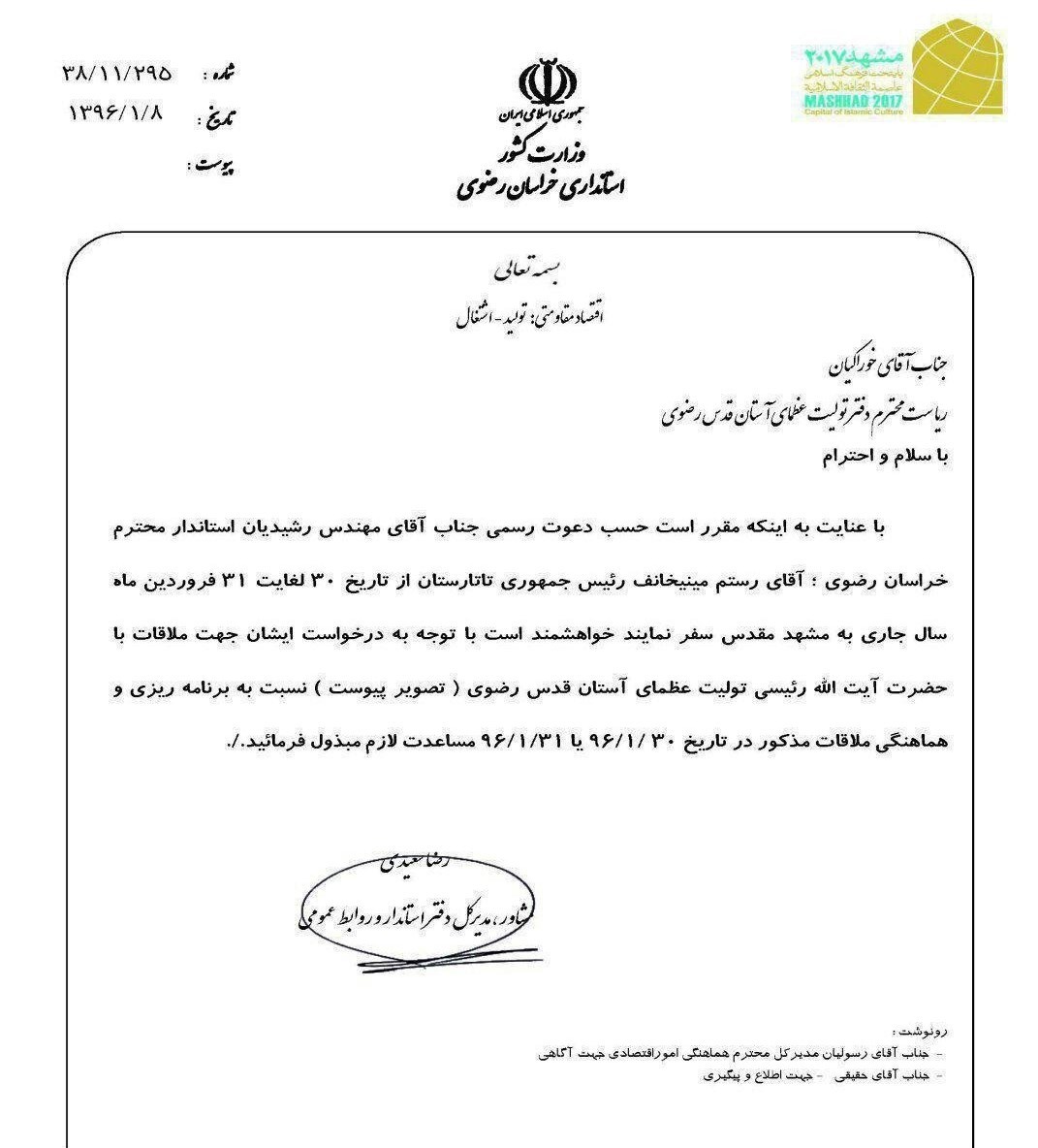 در این سند، استاندار دولت یازدهم طی نامهای از حجتالاسلام رئیسی خواسته تا به عنوان رئیس تولیت آستان قدس رضوی با رئیسجمهور تاتارستان که نماینده رئیسجمهور روسیه در امور دینی نیز هست، درباره مسائل مذهبی در مشهد دیدار داشته باشد.