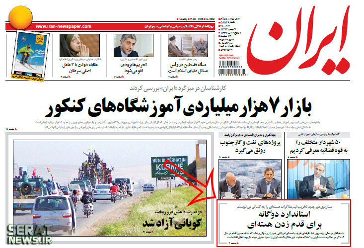 1-‌ در صفحه اول با تيتر «استاندارد دوگانه براي قدم زدن هسته‌اي» در ذيل تيتر آمده است:  «مخالفان در حالي پياده روي 15 دقيقه‌اي ظريف با همتاي امريکايي خود را زير سؤال برده‌اند که مشابه همين اقدام در سال 2009 و در حاشيه نشست ايران و 1+5 که هدايت تيم مذاکره‌کننده را سعيد جليلي عهده‌دار بود، اتفاق افتاده است.»
