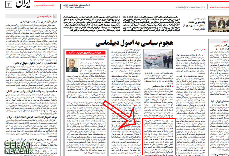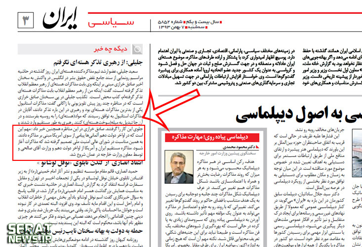 2-‌ در صفحه سوم در قسمتي از مقاله تحت عنوان «هجوم به اصول ديپلماسي» مجدداً خبر کذب مذکور مطرح و در ادامه آمده است:  «براساس برخي منابع داخلي به نقل از نشريه غربي ساندي تايمز سعيد جليلي به‌صورت اتفاقي و بدون برنامه‌ريزي قبلي به پيشنهاد نماينده انگليس در فضاي سبز با معاون وزير خارجه امريکا به مدت 45 دقيقه قدم زده و گفت‌وگو کرده است.»