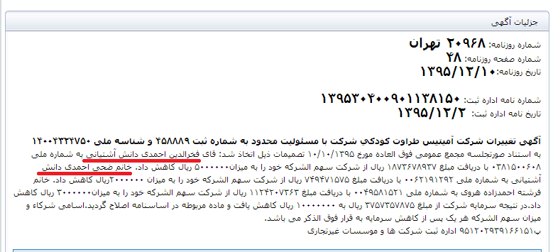 اعضای هیئت‌مدیره این شرکت خانوادگی، آقای وزیر به همراه دختر و همسرش هستند و دختر وزیر یعنی خانم ضحی احمدی دانش آشتیانی مدیرعامل این شرکت است، همچنین آقای دانش آشتیانی بعد از تصدی وزارت آموزش‌ و پرورش، همچنان در ترکیب هیئت‌ مدیره این شرکت باقی‌مانده است و در آخرین تغییرات این شرکت به تاریخ 95/12/10 همچنان عضو هیئت ‌مدیره این شرکت است.