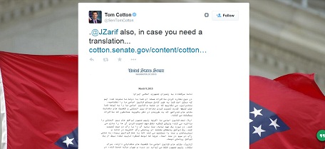 عدالت خواهان گلستانتام کاتن، سناتور جوان و کم تجربه ایالت آرکانزاس آمریکا که تنظیمکننده نامه غیر معمول ۴۷ سناتور آمریکایی به مقامات ایرانی بود، در اقدامی توهینآمیز و غیر دیپلماتیک، با خطاب قرار دادن محمدجواد ظریف وزیرخارجه جمهوری اسلامی ایران در توییتر و گذاشتن متن فارسی این نامه نوشت: «این هم ترجمه نامه در صورت نیاز.»