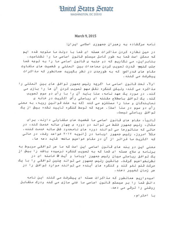 بر این اساس تام کاتن سناتور جوان آمریکایی که نشریه آمریکایی پولتیکو او را سناتور تازه کار نامیده است با قرار دادن این متن ترجمه شده از نامه ۴۷ سناتور آمریکایی به مقامات ایران که پر از ایرادات انشایی بود احتمالا به گمان خود قصد تحقیر وزیر خارجه ایران را داشته است.