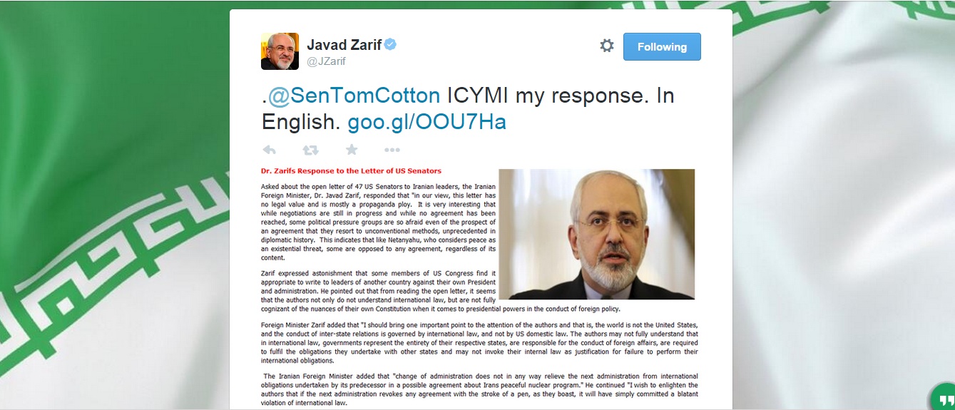 ظریف با خطاب قرار دادن تام کاتن نوشت: «پاسخ من به انگلیسی در صورتی که آن را ندیدهاید.»/فرارو