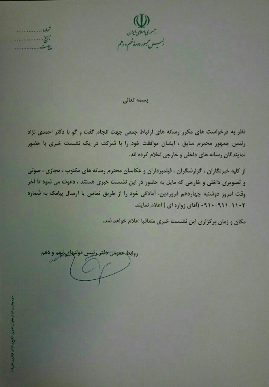 به گزارش پایگاه عدالت خواهان" دفتر احمدی نژاد نامه هایی را برای رسانه ها ارسال کرده که دعوتنامه حضور در این نشست محسوب می شود.