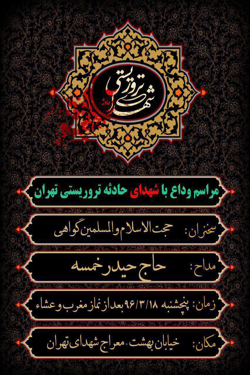 به گزارش پایگاه عدالت خواهان" به گزارش پایگاه عدالت خواهان" مراسم وداع با شهدای حادثه تروریستی تهران ، امشب بعد از نماز مغرب و عشا در معراج شهدای تهران برگزار می شود.